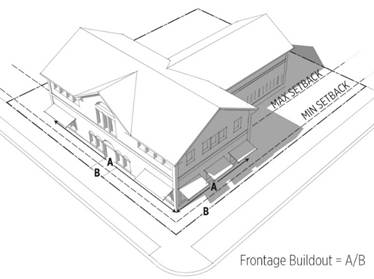 Frontage Buildout. Frontage buildout shall be calculated based on the widest point of a building between the minimum and maximum front setback lines and the width of the lot at the front lot line.